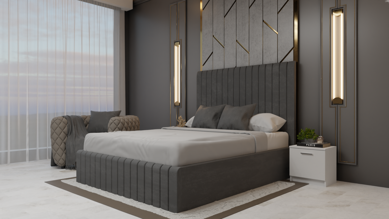 Colecția Dallas se remarcă prin designul modern și elegant, accentuat de riflajele decorative care aduc profunzime și rafinament spațiului. Patul Cairo tapițat în catifea fină, cu tăblie înaltă și linii contemporane, oferă un confort desăvârșit și un plus de stil. Ansamblul creează o atmosferă caldă, echilibrată și sofisticată – ideală pentru un dormitor modern și primitor.