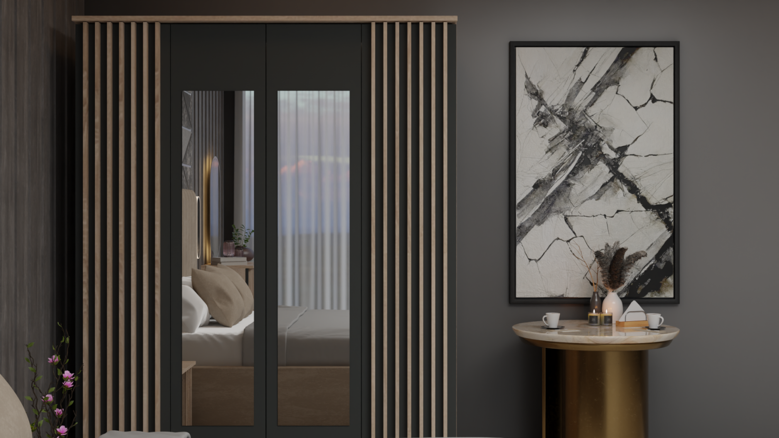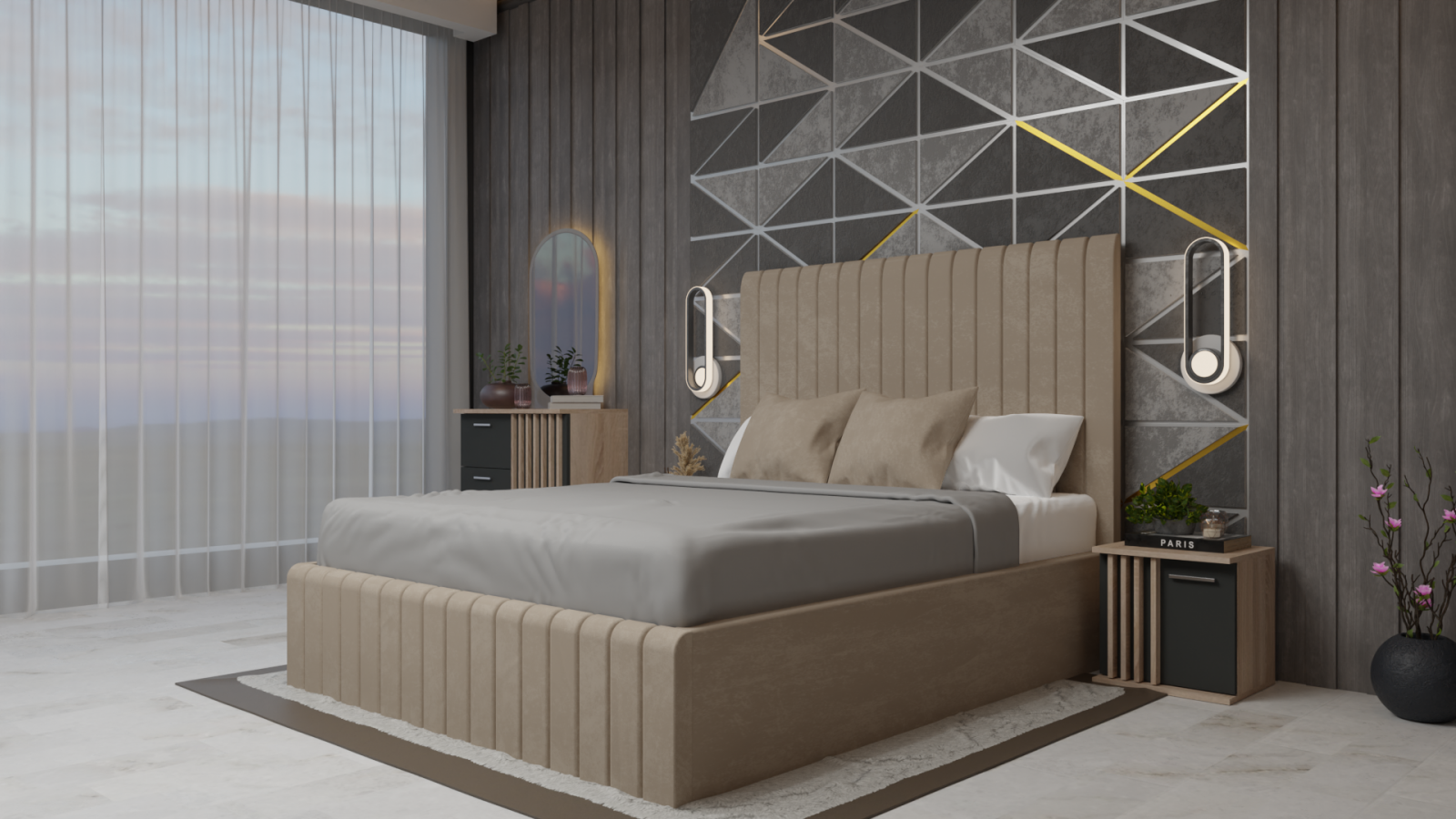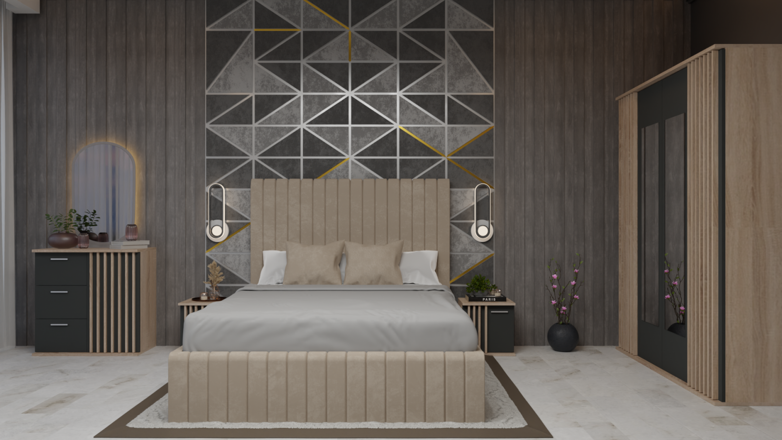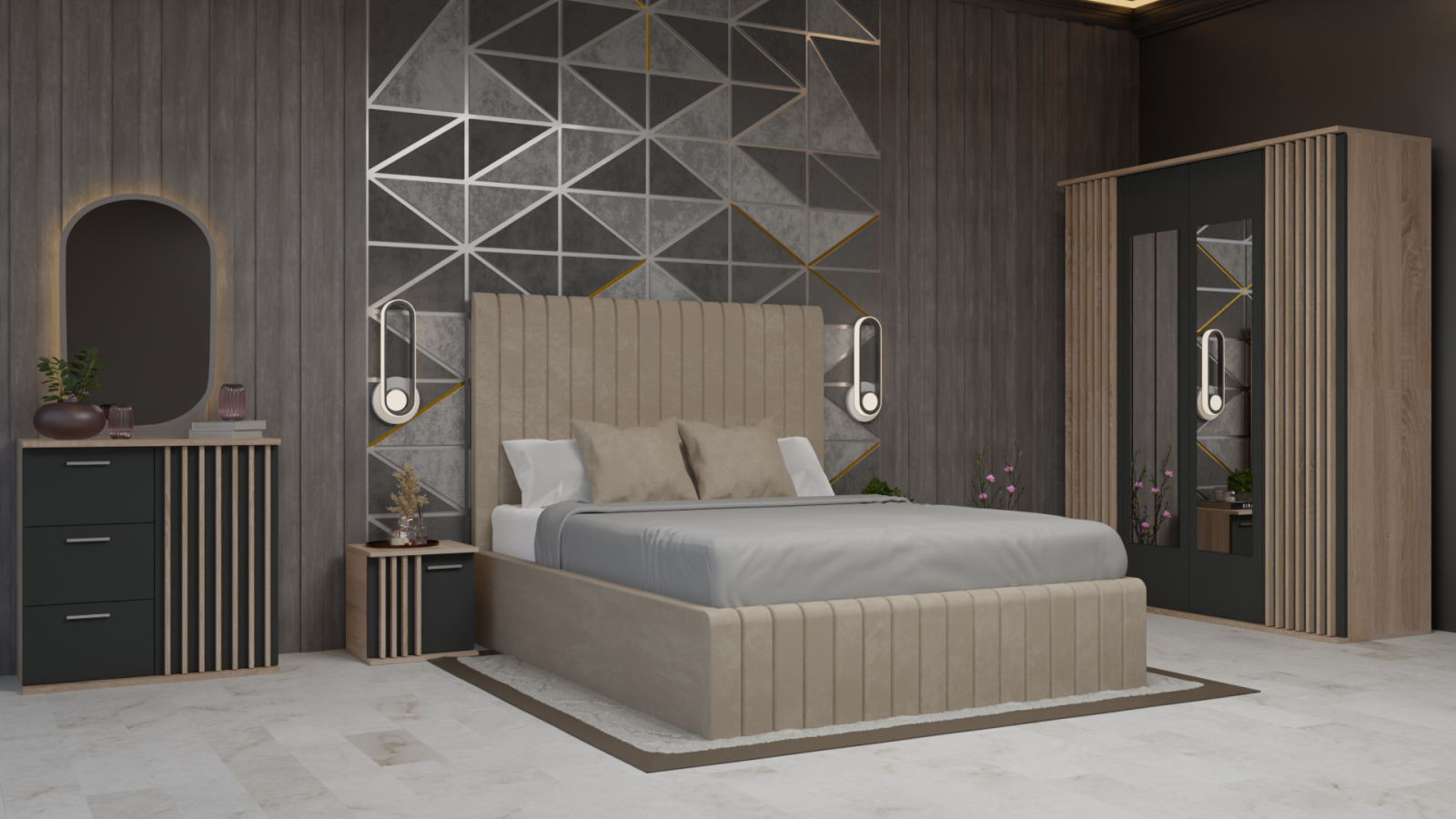 Colecția Dallas se remarcă prin designul modern și elegant, accentuat de riflajele decorative care aduc profunzime și rafinament spațiului. Patul Cairo tapițat în catifea fină, cu tăblie înaltă și linii contemporane, oferă un confort desăvârșit și un plus de stil. Ansamblul creează o atmosferă caldă, echilibrată și sofisticată – ideală pentru un dormitor modern și primitor.