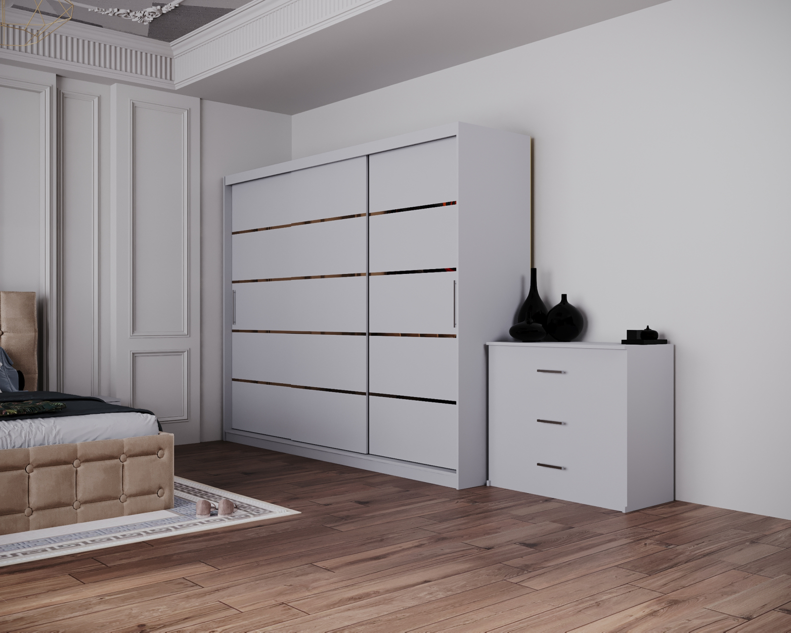 Dormitor Regal cu Pat Tapitat Stofa Bej cu dulap 250*200 usi glisante Alb, noptiere si comoda