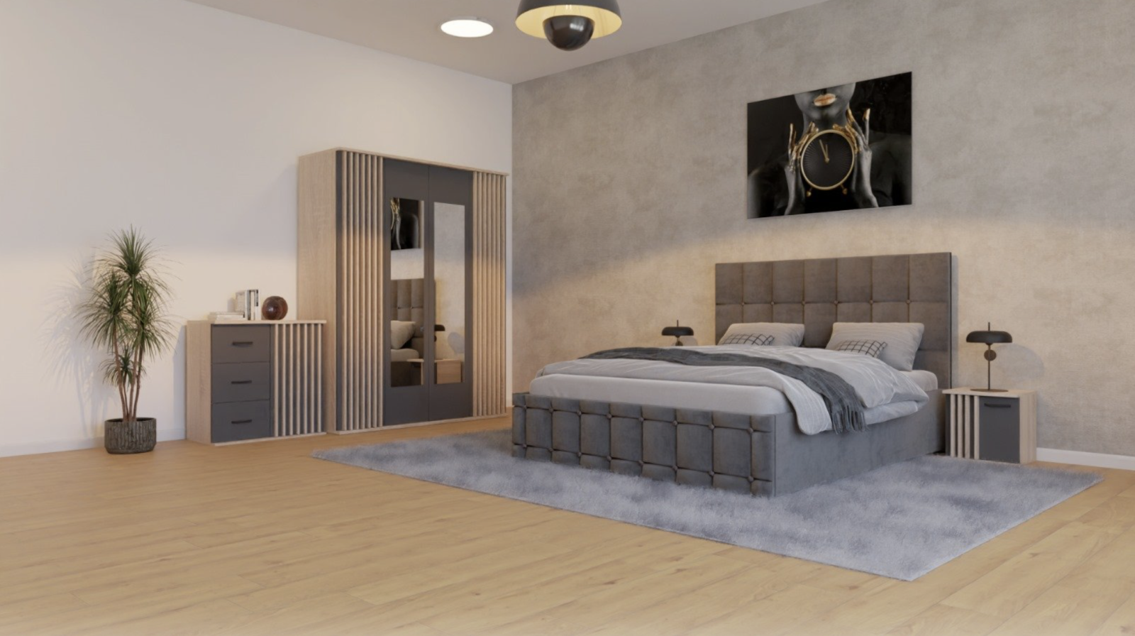Colecția Dallas se remarcă prin designul modern și elegant, accentuat de riflajele decorative care aduc profunzime și rafinament spațiului. Patul Regal tapițat în catifea fină, cu tăblie înaltă și linii contemporane, oferă un confort desăvârșit și un plus de stil. Ansamblul creează o atmosferă caldă, echilibrată și sofisticată – ideală pentru un dormitor modern și primitor.
