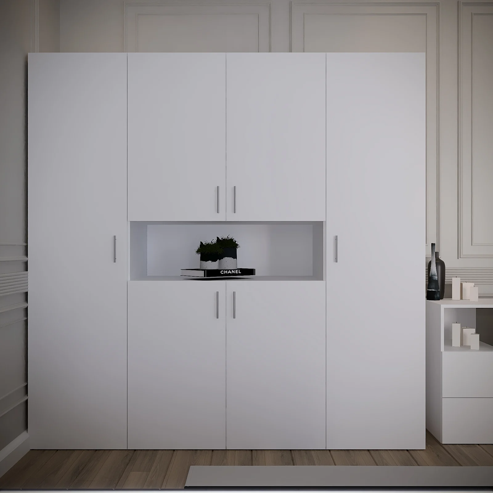 Comoda și dulapul completează ansamblul, oferind spațiu generos pentru depozitarea hainelor și a altor obiecte personale.