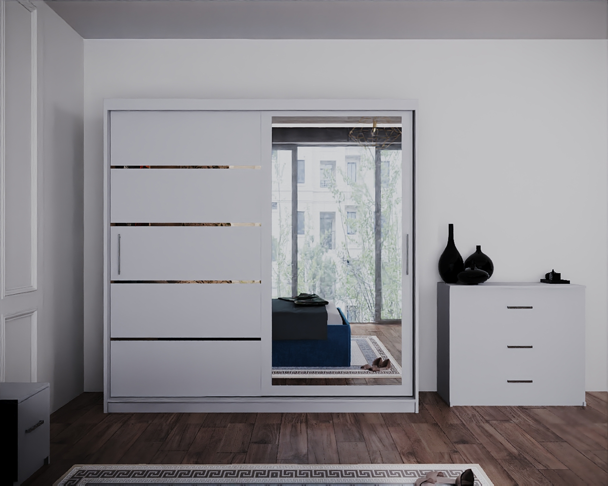 Dormitor Regal cu Pat Tapitat Stofa Albastra cu dulap 200*200 usi glisante Alb cu Oglinda, noptiere si comoda