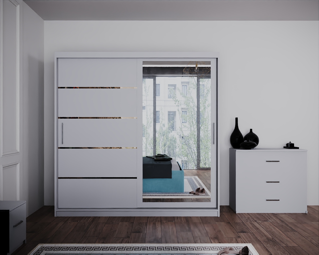 Dormitor Regal cu Pat Tapitat Stofa Turcoaz cu dulap 200*200 usi glisante Alb cu Oglinda, noptiere si comoda