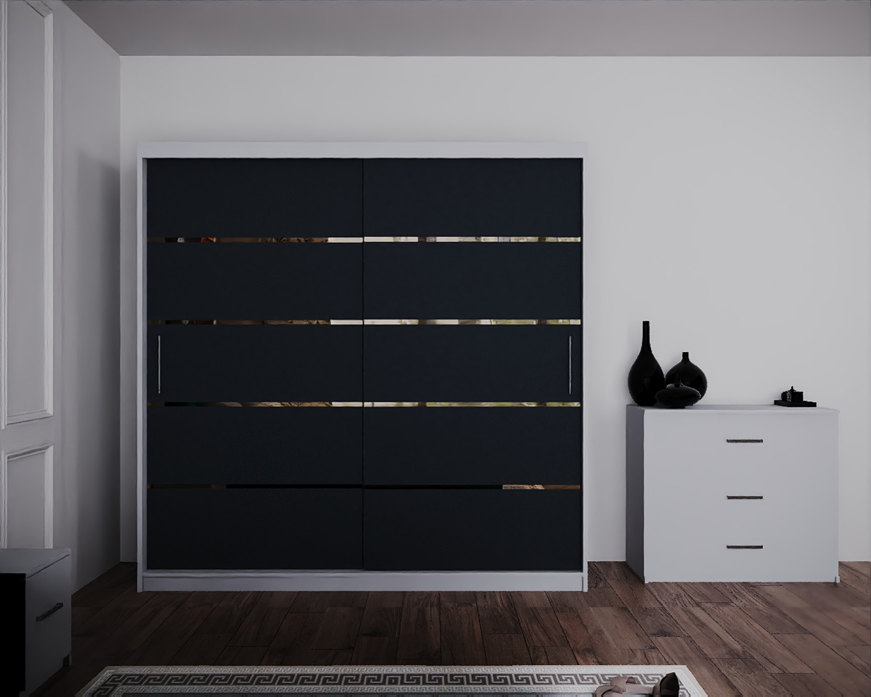 Dormitor Regal cu Pat Tapitat Stofa Verde cu dulap 200*200 usi glisante Alb&Antracit cu, noptiere si comoda