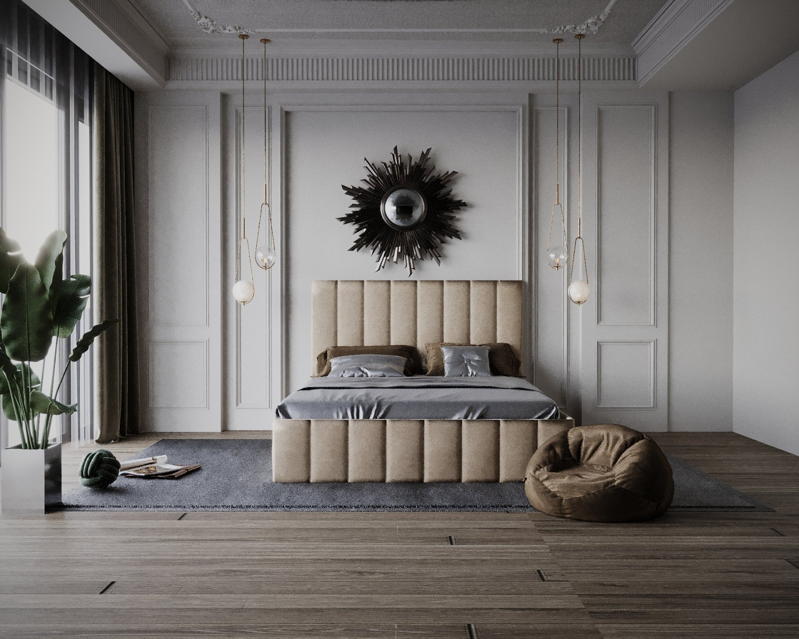 Patul este realizat din materiale calitative, are o strucura din pal melaminat fiind tapițat cu un material textil catifelat.