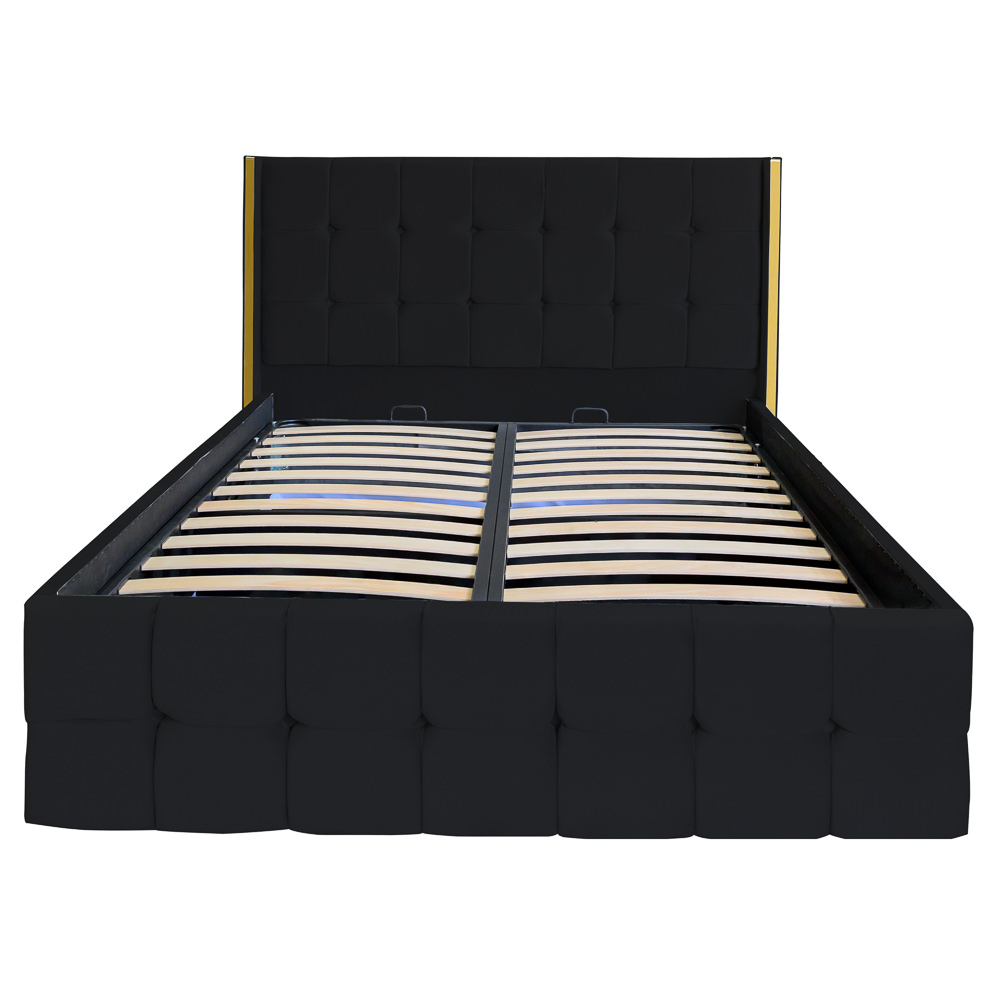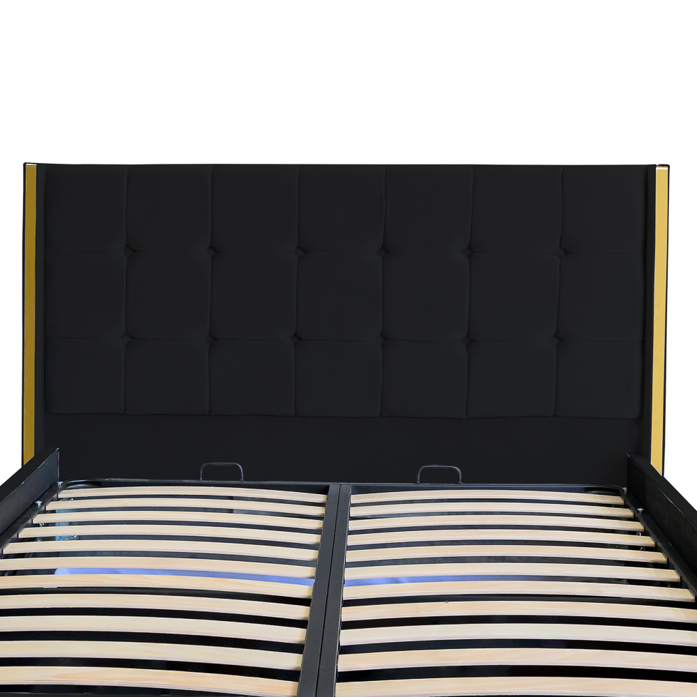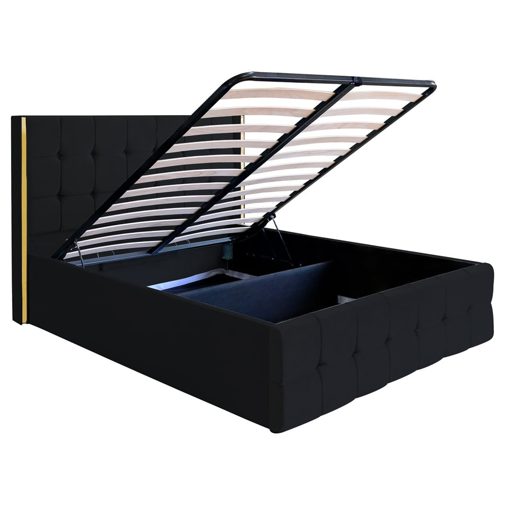 Tăblia înaltă, capitonată cu detalii geometrice, oferă un aspect impunător și un plus de confort atunci când te relaxezi. Structura solidă, realizată din materiale de calitate superioară, asigură rezistență în timp, iar somiera rabatabilă dezvăluie un spațiu generos de depozitare, ideal pentru lenjerii, perne sau alte obiecte personale.